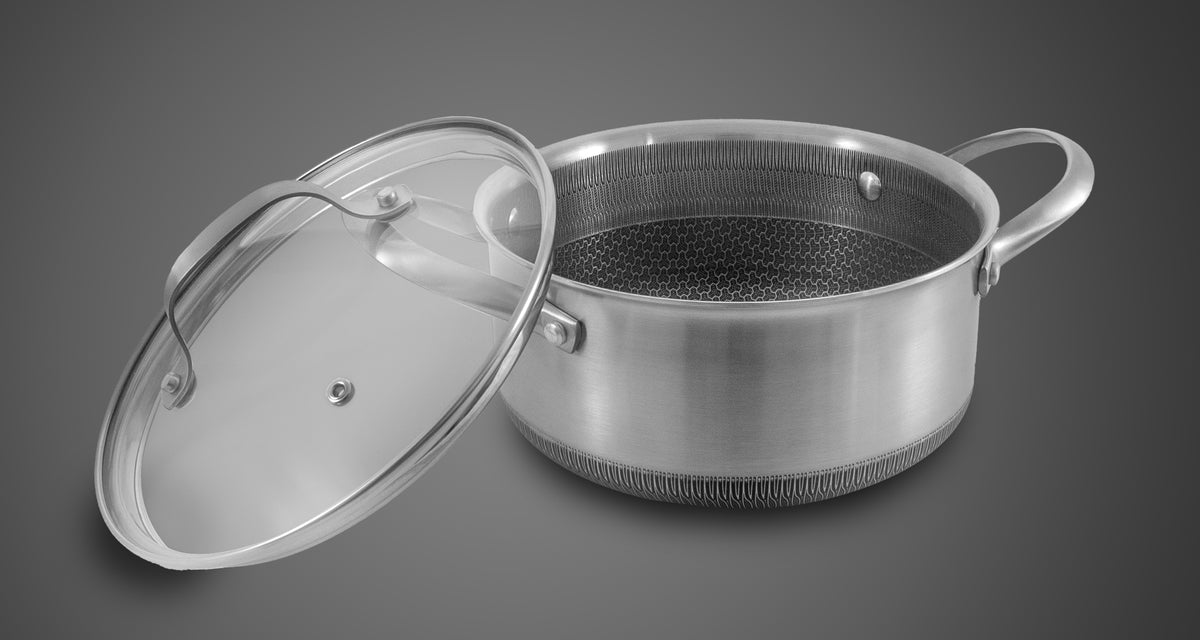 ✓ Fortschrittliche Antihaft-Oberfläche – Die innovative Gravur mit Hexagonen und Edelstahlpunkten verhindert das Anhaften von Speisen und ermöglicht Kochen mit weniger Öl.